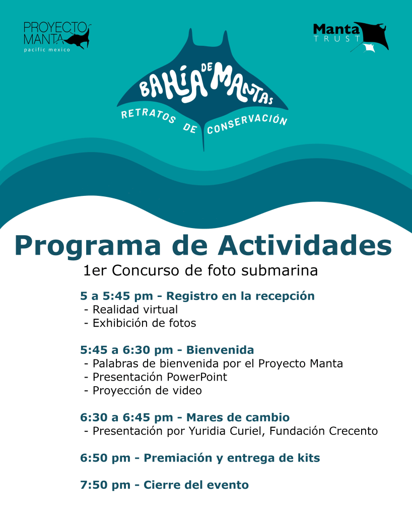 Durante el evento podremos sumergirnos con las mantas con experiencias de realidad virtual y videos, presenciar increíbles fotografías subacuáticas, escuchar interesantes pláticas sobre el cuidado de nuestros mares y costas y presenciar la premiación de las mejores fotos sometidas al concurso.